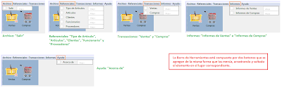 La “Barra de Menú” está compuesta por los siguientes “Menús”: Archivos, Referenciales, Transacciones, Informes y Ayuda. Cada elemento se agrega arrastrando y soltando al lugar correspondiente desde la paleta y modificando el nombre por defecto del elemento. A su vez cada “menú” tiene sus elementos que se van a desplegar al hacer clic sobre el ella. Una imagen con los elementos desplegados para entender mejor. (Clic sobre la imagen para ampliar).